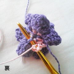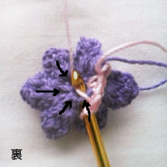 | ←表から見るとかぎ針はココを通ってます。 6段目:4段目と同じ様に花びらを編む。 7段目:5段目のくさりの下を通り3段目のこま編みにこま編みを編み付けます。 このように繰り返していくと どんどん花びらが増えます。 増える程中心に集まってきます。 | ||