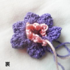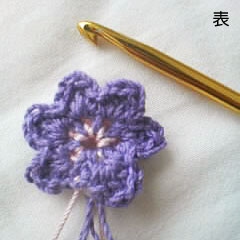 | 1段目:輪の作り目にこま編み→2目くさり編みを6回繰り返す。 2段目:1段目のくさりを束にとって、こま編み→1目くさり編み→2目長編み→1目くさり編み→こま編みで花びらを作る 写真は2段目を編み終えたところ。 | ||