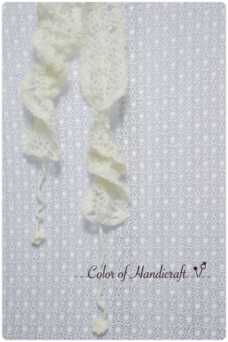 それをモヘアでゆるめに編んでふち編みふりふりしてマフラーになりました。