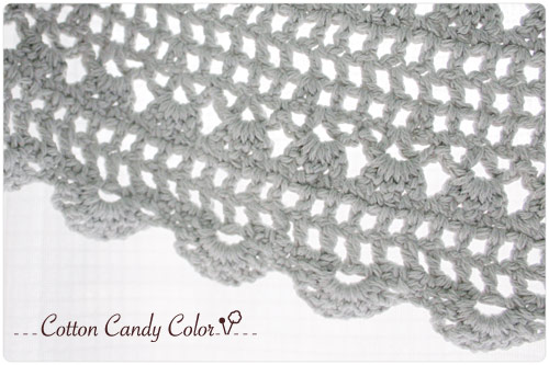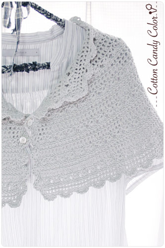 5号針で編み進めて、ちょうど7玉使い切りました。前はエジングの穴をボタンホールにして留めてます。
