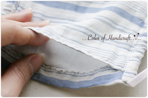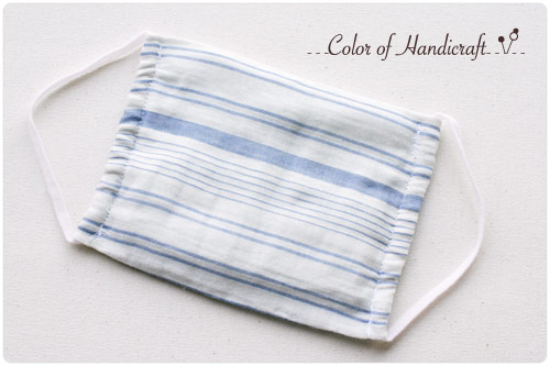 青のストライプ生地だったのでオフホワイトの紐にしようと思ったんですが、